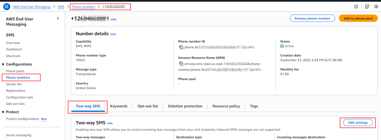 Complete the Two-way SMS configuration on your End User Messaging SMS numbers