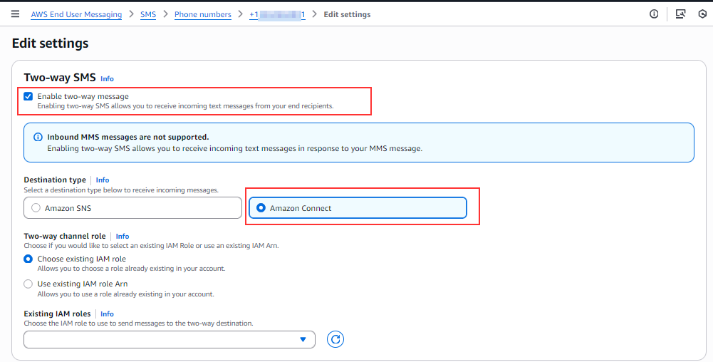 - From the Edit settings screen, check the Enable two-way message checkbox at the top, and select Amazon Connect as the Destination type...