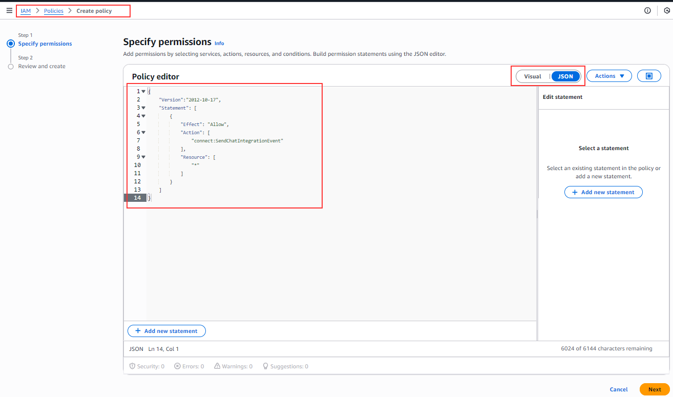 On the Policy Specify permissions page, switch to JSON, and paste the required IAM policy from the AWS documentation link above. The end result should look like this: