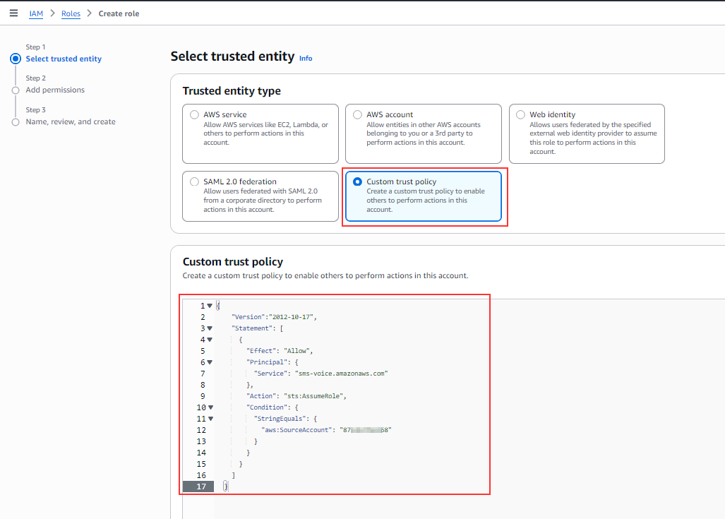 In the custom trust policy JSON editor at the bottom, replace the starter JSON policy it provides with the trust policy from the AWS documentation link above (replacing the SourceAccount in the policy with your AWS account number). The end result should look like this: