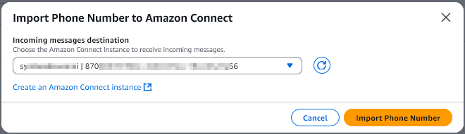 - Click Save changes on the bottom-right of the Phone Number Edit settings page to complete the Two-way SMS configuration. When you do this, a dialog will show like below, asking which Amazon Connect instance the Phone Number should be imported to.