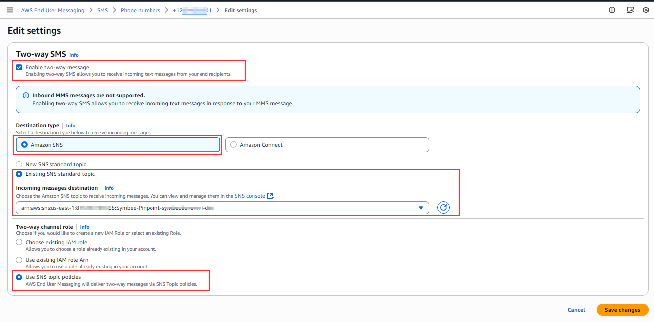 - Inbound SMS message Destination type: Amazon SNS (Simple Notification Service)