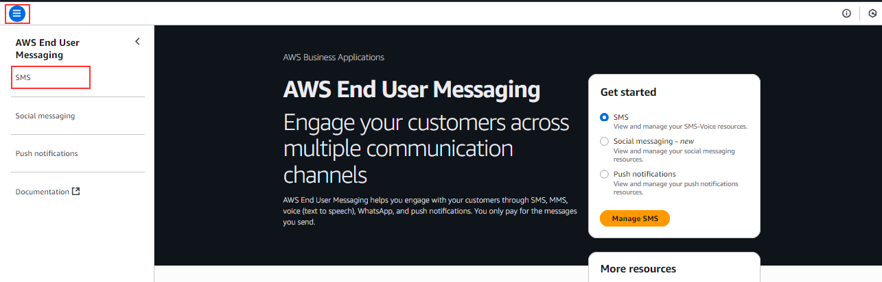 - In the AWS End User Messaging console, from the left navigation bar, select SMS...