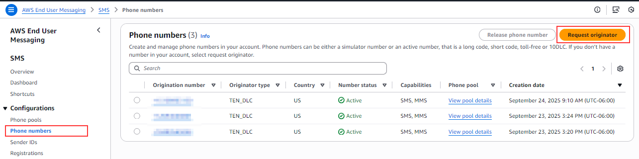 - On the AWS End User Messaging SMS console, click Phone numbers in the left navigation bar, and click Request Originator in the top-right...