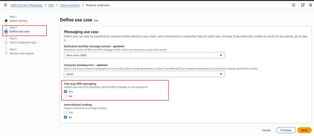 - On the next Define use case screen, select appropriate values, making sure to select Yes for Two-way SMS messaging, and click Next...
